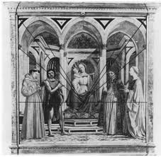 This panel is in the State Museums of Berlin. Up on the balcony Diocletian gives the command for her execution. In none of these predella panels is there a gold-leaf background. The sky is depicted and earth is a light-filled realm with natural-looking figures sometimes in urban architectural settings. The emphasis is on the human world of the saints and their connections to the holy figures they pray to for help.