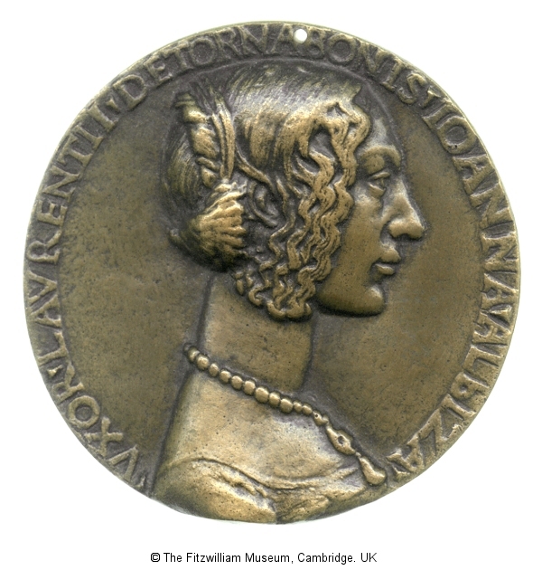 the mother of Lorenzo the Magnificent of the Medici family. Through the Medici bank connections, Lorenzo, shown here in portrait medal and in Ghirlandaio's fresco in Santa Maria Novella,